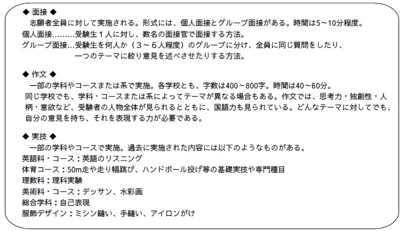 学科やコースの特色にふさわしい能力・適性・興味・関心などの多様な個性をみるために、面接・作文・実技などの試験が以下の学校の学科、コースで行われます。