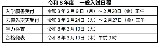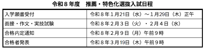 令和6年度入試までは、1月下旬に特色化選抜、2月上旬に推薦入学が実施されていましたが、令和7年度入学者選抜からは、特色化選抜及び推薦入学を同一日に実施しています。特色化選抜で内定にならなかった場合、一般入試に出願できます。選抜方法は、面接を行うほか、作文または実技試験を実施する学校もあります。