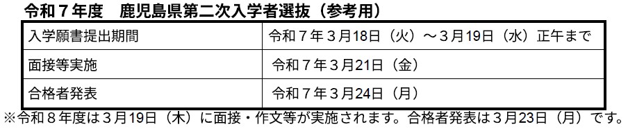 「第一次入学者選抜」の合格者が募集定員に満たない学科(開陽高は除く)において実施する入試で、公立高校で学びたい意思を持つ生徒に再度受検の機会を提供するものです。再度の学力検査は行わず、「調査書」の記録、志願者全員に行う「面接」「作文」および第一次入学者選抜における「学力検査」の結果等を総合して合格者を決定します。実施学科と募集枠については、「第一次入学者選抜」の合格者発表当日に発表します。出願できる者は、鹿児島県の公立高校を受検し合格しなかった者(ただし、同一校の同一学科には出願できない。また、私立高校に合格し入学手続きをした者は除く)および鹿児島県公立高校の第一次入学者選抜に出願したが「学力検査」を受検できなかった者とします。