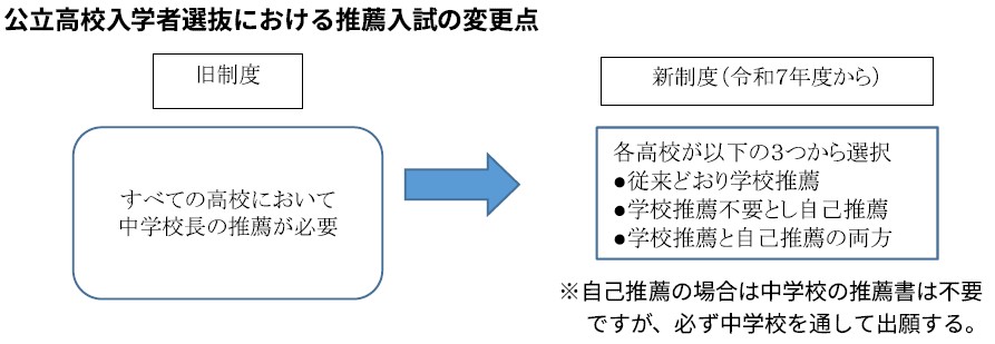 また、令和7年度から、推薦入試において「自己推薦」による出願が可能になりました。上記のような中学校全体での決定が無く、自己の特徴や長所を最大に生かせると考える高校への、より積極的な出願ができるようになりました。定員については、現行どおり(普通科10%以内、専門学科30%以内)となります。
