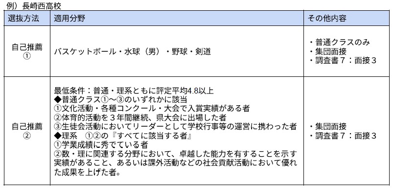 文化・スポーツを含む主体的な活動で顕著な実績をもつと自ら認める者で、かつ当該校に進学する強い意志を持つ者。受験上の通学区域は長崎県立高等学校の通学区域に関する規則によります。