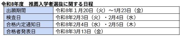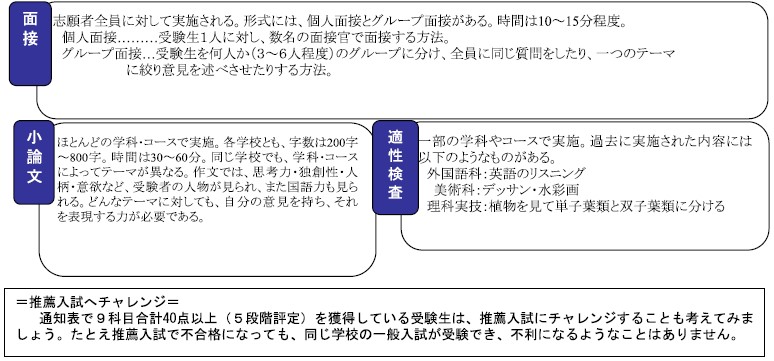 選考方法 面接・作文・適性検査などの結果と、中学校から提出される調査書や推薦書などの書類とを総合して選考されます。内申点が高くないと推薦入試での合格は難しくなります。