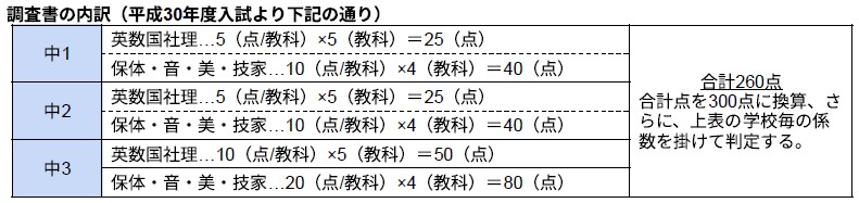 一般入試の募集人員は、各学校の入学定員から推薦入試合格内定者数を減らした数で発表されます。推薦入試で合格が内定した生徒は、一次入試に出願できません。選抜方法は、学力検査の得点(300点満点/5科目×60点;各50分)と9科目の調査書、また一部の学校においては、適性試験や面接を総合的に見て合否を決定します。その際、調査書の合計点と学力検査成績の比率は、下表のように高校ごとに決まっており、面接の実施の有無も高校によって異なります。