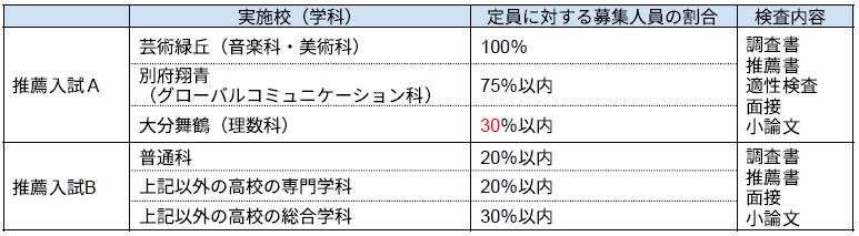 推薦入試は、各中学より学校長の推薦を受けた生徒に対し、一般入試のような学科試験ではなく、面接・小論文や適性検査(実技)などが課される試験です。大分県立高校の推薦入試には、下記A・Bの2種類があります。