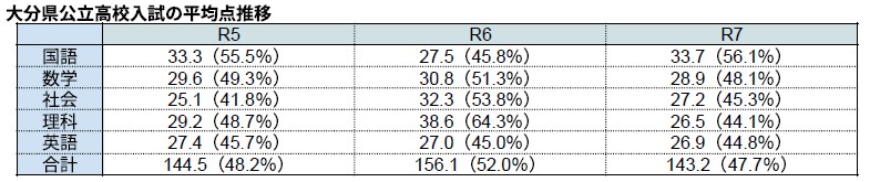 毎年、大分県教育委員会が公立高校の全受験者の得点を集計し、平均点を発表しています。過去3年の結果を下表にまとめました。令和6年度は令和5年度と比較して、数学が平均で1.2点、社会が平均で7.2点、理科が9.4点程度増加し、国語・英語を除いては取り組みやすい内容となっていました。令和7年度においては、社会が平均で5.1点、理科が平均で12.1点下がっており、難易度が上がりました。大学入試改革の影響で思考力・判断力・表現力を求める試験に変わっていくなか、今後も情報と情報を関連付け整理する力や、目的や相手に応じて自分の考えをまとめ表現する力を計る問題が出題される可能性が高いと考えられます。大分県の公立入試は年毎の平均点変動が大きいため、過去の傾向を把握しながら、しっかりとした入試対策に取り組む姿勢が必要となります。